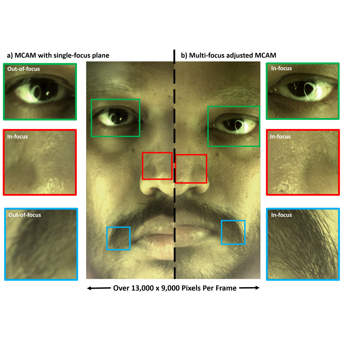 We developed a multi-focus imaging system comprising a 54-camera array by adjusting focal plane distribution to capture dynamic facial expressions with high resolution, large field-of-view, and extended depth-of-field.
